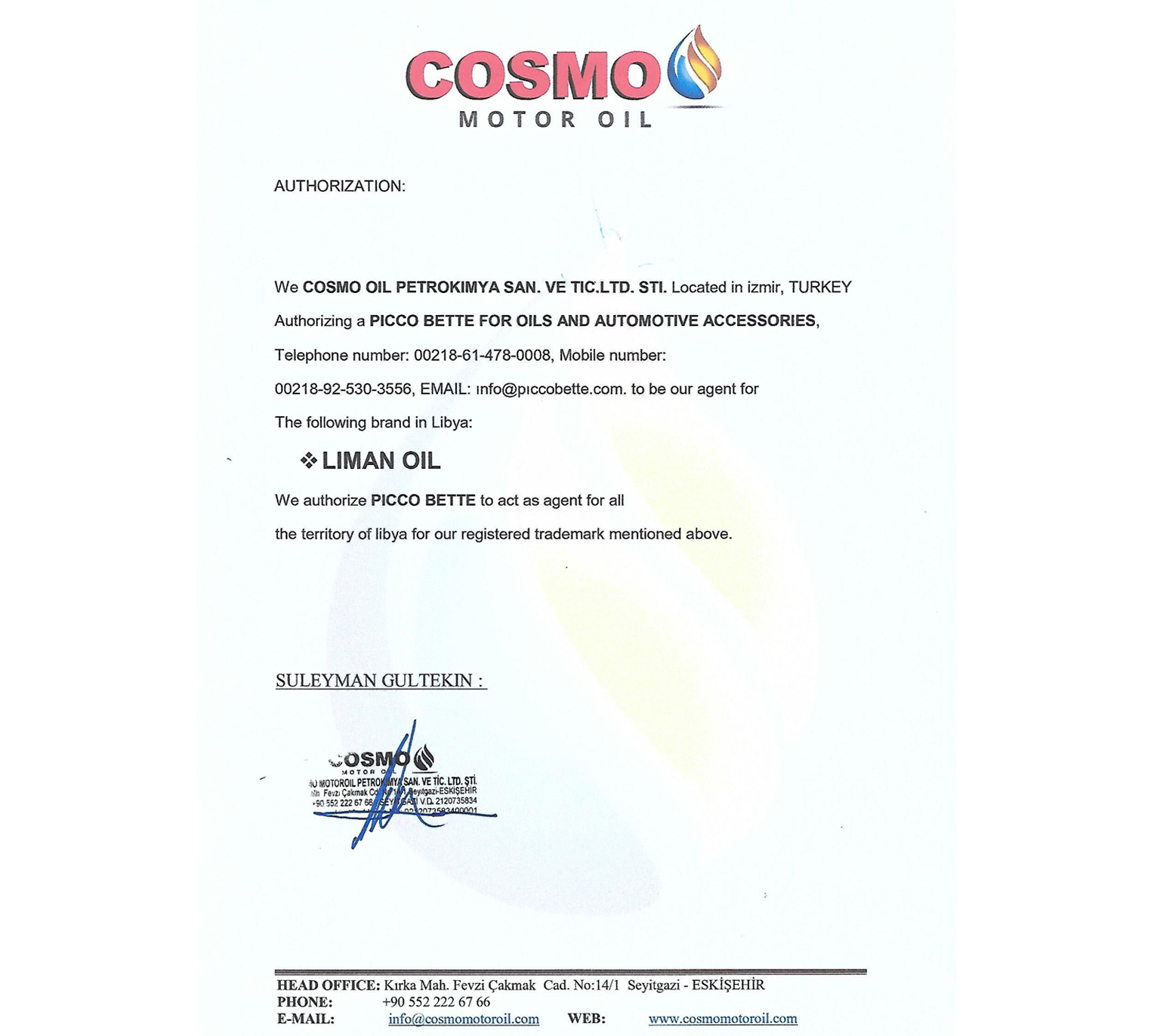 تأسست كوزمو موتور أويل ، العلامة التجارية الأولى لكوزمو موتور أويل ، منذ عشر سنوات في إزمير بتركيا ركز كوزمو أساس تأسيسه ومجموعة من الأنشطة لتلبه احتياجات التسويق الصناعي.وقد تلقت كوزمو مناقصات بنجاح فيما يتعلق بالعرض والطلب في الأسواق الوطنية والدولية، حيث قدمت منتجات وخدمات للشركات العامة والخاصة والأجنبية.